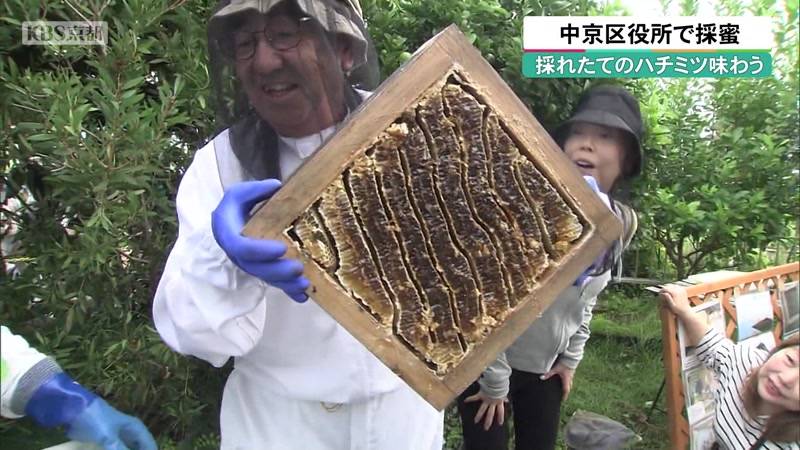 中京区役所で29日、ハチミツの採取が行われ、見学に訪れた市民らがとれたてのハチミツを味わいました。