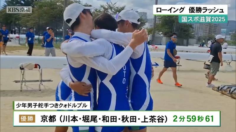 5人が力を合わせて進む少年男子かじ付きクォドルプルで宮津天橋・京都工学院の3年生チームが挑み、京都勢としてこの種目初めての優勝、高校最後のレースで涙を浮かべました。