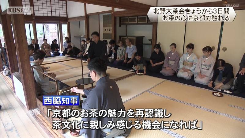 大阪・関西万博を契機に京都の茶文化を広める「きょうとまるごとお茶の博覧会」のグランドフィナーレを飾る「北野大茶会」が11日から京都市上京区の北野天満宮で始まりました。京都市上京区の北野天満宮で11日から3日間開催される「北野大茶会」を記念して、11日午前、オープニングセレモニーが行われ、主催者を代表して京都府の西脇知事が「京都のお茶の魅力を再認識し、茶文化に親しみ感じていただく貴重な機会になれば」とあいさつしました。北野大茶会は、1587年に北野天満宮で豊臣秀吉が開いた「北野大茶湯」にちなんだもので、大阪・関西万博を契機に京都の茶文化を国内外の人々に広める「きょうとまるごとお茶の博覧会」のグランドフィナーレを飾るイベントです。会場では、表千家や裏千家、堀内家など、茶道4家元2宗匠と煎茶道3流派が日替わりで茶会を開くほか、府内の団体による野点茶会も行われます。訪れた人たちは、温かいお茶と和菓子を味わいながら優雅なひと時を過ごしていました。このイベントは、13日まで北野天満宮で行われます。