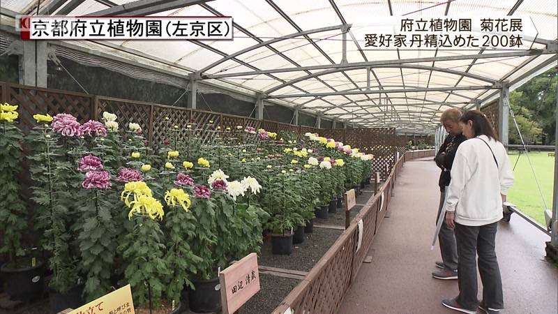 菊の愛好家が丹精込めて育てた自慢の作品が並ぶ毎年恒例の菊花展が、京都市左京区の府立植物園で開かれています。菊花展は、府内の菊の愛好家の団体・京都菊花連合会の会員らが丹精込めて育てた菊を展示していて、ことしは様々に仕立てられたおよそ200鉢の菊の花が植物園を彩ります。このうち、小菊を用いた盆栽仕立ての作品は、長い根が岩や木の上を這ったり網のような模様を作るなど、多彩な造形の美が訪れた人たちの目をひきつけます。また小菊を刈り込んだり編んだりして仕立てたオブジェも見どころで、バラエティと色彩豊かな作品は幅広い層に菊の魅力をアピールしています。ことしは、厳しい暑さが長く続いたことから菊の栽培が難しかったということです。愛好家らの力作が並ぶ菊花展は、11月15日まで開かれています。