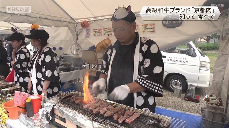 京都の高級和牛ブランド「京都肉」を多くの人に知ってもらおうというイベントが、26日、京都市左京区の岡崎公園で開かれ、来場者が有名店の肉料理を楽しみました。「京都肉祭(にく・まつり)」は、府内の食肉生産者や販売者などでつくる京都肉牛流通推進協議会が、ブランドの知名度向上などを目指して開いているもので、今回で10回目です。京都肉は、他府県ではなく府内で最も長い期間、飼育された黒毛和牛、かつ高い格付けを持つなどの4つの条件を満たしたもので、南丹地域で生産されています。会場には、京都を代表する肉料理の有名店など13ブースが設けられ、串焼きや鉄板焼き、ステーキ弁当といった京都肉をふんだんに使ったメニューが販売されました。会場では、肉の焼ける煙と香ばしい香りが漂う中、来場者は笑顔で京都肉を堪能していました。