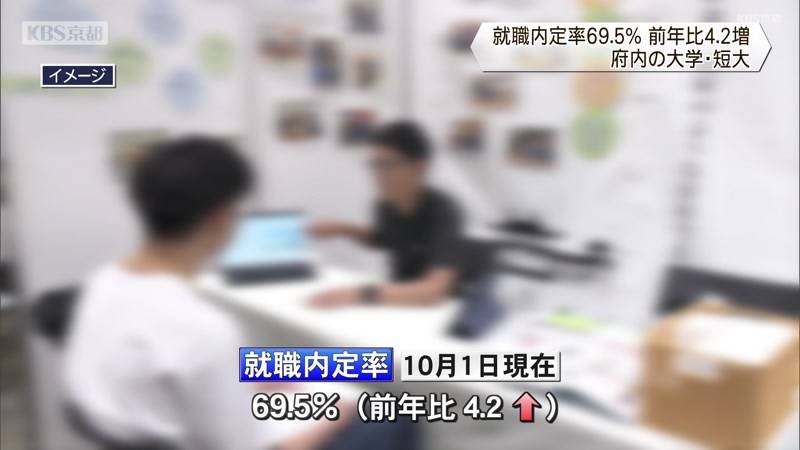 京都府内の大学と短大の来年春の就職内定率は69.5%で、去年に比べ4.2ポイント増加しました。これは、京都労働局が京都府内の大学や短大37校から回答を得たものです。10月1日現在、京都府内の大学や短大の就職内定率は69.5%で、4.2ポイント増加しました。就職内定率の増加は2年ぶりです。また、大学卒業者の就職内定率は70.2%で前年より3.9ポイントの増加、短大卒業者の就職内定率は48.1%で前年に比べ10.1ポイントの増加となりました。男女別の就職内定率は男子が72.4%、女子は67.2%です。