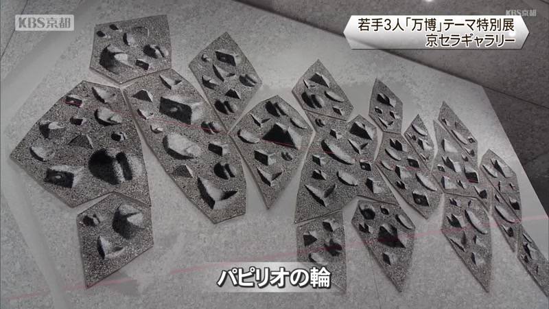 京都市立芸術大学大学院修了生3人による万博をテーマにした特別展が、1日、京都市伏見区の京セラギャラリーで始まりました。この特別展は、新たな創造の場を提供し、若手作家を支援しようと、京セラと京都市立芸術大学が今回初めて開き、制作に携わった若手作家3人が紹介されました。特別展のテーマは万博で、会場の中央には、ビニールシートで制作した「神殿と獄舎と」が展示されています。作品の内部に入ることができ、エアコンのコントローラーで内部の温度を変化させたり、風で作品を揺らしたりできます。また、万博の様々な形のパビリオンをひとつの地球に例え、絵画とアニメで表現した「パピリオの輪」や、日中戦争の影響で延期となった1940年「東京万博」の会場予定図を拡大した壁面図に加え、実際に販売された回数券などが展示されています。この特別展は、12月13日まで行われています。