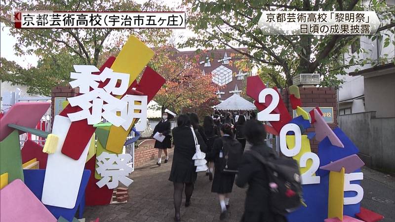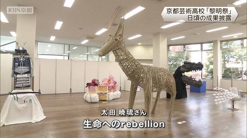 宇治市の京都芸術高校で生徒たちの日ごろの創作活動の成果を披露する文化祭=黎明祭が2日から始まりました。ことしの黎明祭では、全校生徒395人のみずみずしい感性あふれるおよそ2,000点が校内に並びました。特に3年生にとっては卒業制作展も兼ねていて、学びの集大成ともいえる作品は見ごたえがあります。なかでも立体造形コースの太田暁琉さんの作品「生命へのrebellion」は竹をリサイクルして巨大な鹿を作り上げていて、神の使いと言われる鹿に循環や輪廻転生といった意味を込めたということです。また絵画コースの山本珠生さんの作品「本質」は、ガラスブロックに映る自分を描いていて、歪んで見える自分の姿こそ人間の本質という着眼点に感心させられます。なお3年生の作品は12月2日から京都市京セラ美術館で一般公開されます。