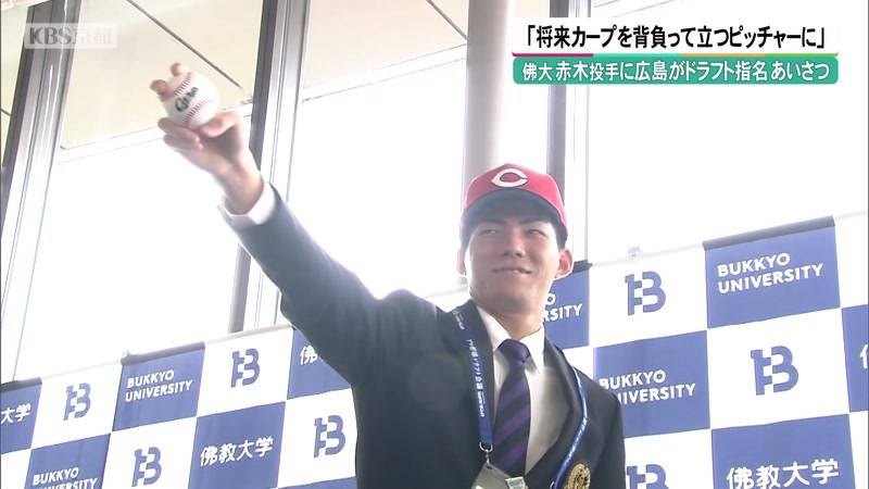 京都市北区の佛教大学では、佐藤和順学長や赤木投手らが、広島のスカウトを出迎えました。このあと、スカウトから「今持っている球種を磨き、将来カープを背負って立つピッチャーとして期待しています」とあいさつされ、スカウトの鞘師智也さんからカープの帽子を被せられると、ボールを握りしめて引き締まった表情を見せていました。