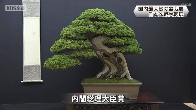 盆栽の展示・販売を行う国内最大級の催し・日本盆栽大観展が、京都市左京区のみやこめっせで開かれています。ことしで45回目を迎える日本盆栽大観展には、会場には海外も含めた愛好家が丹精込めて育てた150点と特別出品の作品が展示されています。展示されている多くの盆栽は事前に審査され、内閣総理大臣賞に選ばれた作品は、見事な枝ぶりをはじめ、木の皮の美しさや葉の色合いが評価されました。そのほか、美しく紅葉する山もみじなどが並んでいます。盆栽は海外でも人気が高まっていて、会場には多くの外国人ファンの姿も見られました。また、恒例の展示販売も人気を集めているほか、23日には無料の解説ツアーが行われます。この催しは11月24日まで、左京区のみやこめっせで開かれています。
