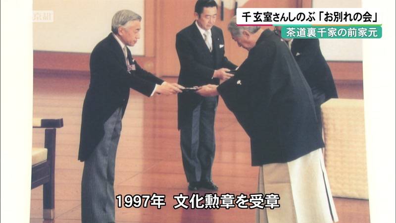 「お別れの会」は、京都市左京区の国立京都国際会館で開かれました。親族や関係者などが参列する午前の部の会場では、午前10時過ぎ、千玄室さんの遺影が掲げられた祭壇の前で参列者が次々と白菊を献花台に供え、玄室さんをしのび静かに手を合わせていました。また、玄室さんの102年の生涯の足跡を60点あまりの写真で振り返るパネル展示も行われました。1923年(大正12年)生まれで、裏千家15代家元だった千玄室さんは、学徒出陣で太平洋戦争に出征し、旧海軍の特攻隊員として出撃前に終戦を迎えた経験を生涯にわたって語り続けました。そして、「一盌からピースフルネスを」の理念を掲げ、世界を歴訪して、お茶の文化の普及と世界平和のために尽力し、1997年には文化勲章を受章しました。