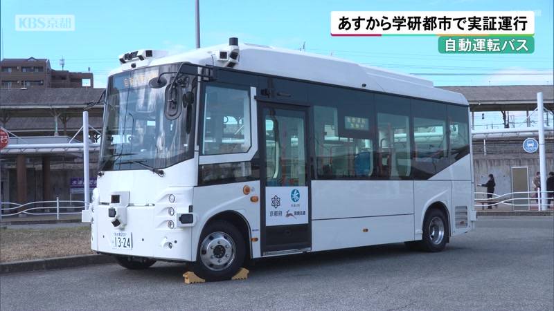 京都府による自動運転バスの実証運行が京田辺市と木津川市でスタートするのを前に、車両の出発式と関係者の試乗が行われました。
