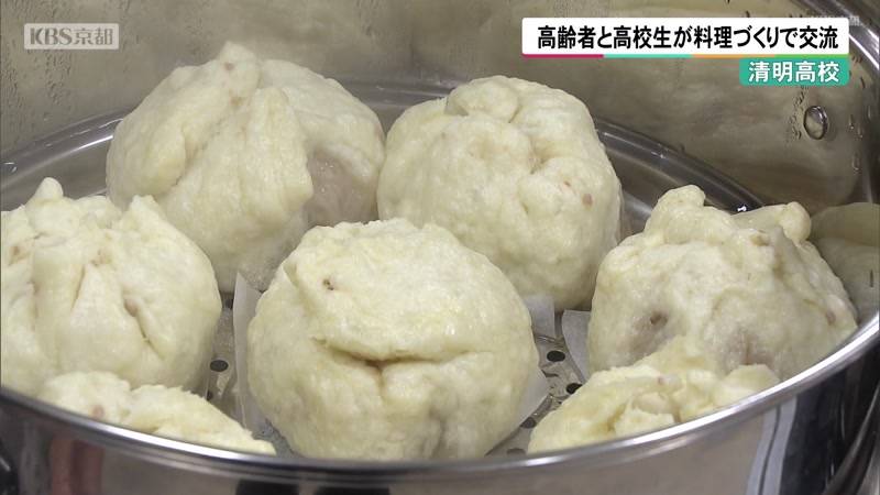 交流会には、高齢者の活動を支援している京都SKYセンターの70代を中心とした高齢者11人と高校生9人が参加し、5つのグループに分かれて肉まんと、さつまいもスープづくりに挑戦しました。この取り組みは、生徒の主体性やコミュニケーション力の向上などを目的に去年から行われているもので、高校生が家庭科の授業で教わったコツを披露すると、高齢者らは、人生経験の話を交え、笑顔で若い世代との交流を楽しみました。参加した高齢者と高校生は、出来上がった料理をみんなでおいしそうに味わいました。