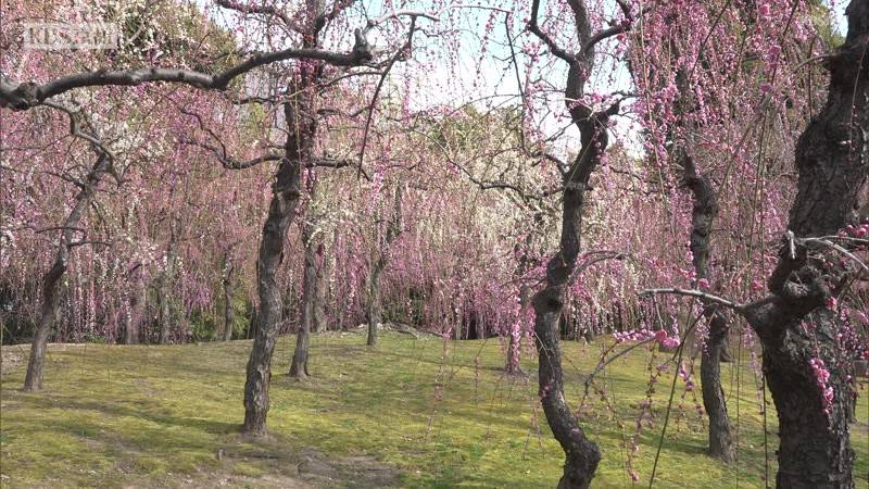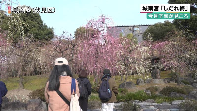 白と薄紅色の花をつけたやわらかな枝が垂れ下がる「しだれ梅」。境内の神苑・春の山には、およそ150本のしだれ梅が植えられていて、今月上旬から咲き始めたということです。城南宮によりますと、今はまだ4分咲きだということですが、訪れた人たちは、ほのかに甘い香りが漂う庭園で梅の花を眺めたり写真に収めたりして春の訪れを楽しんでいました