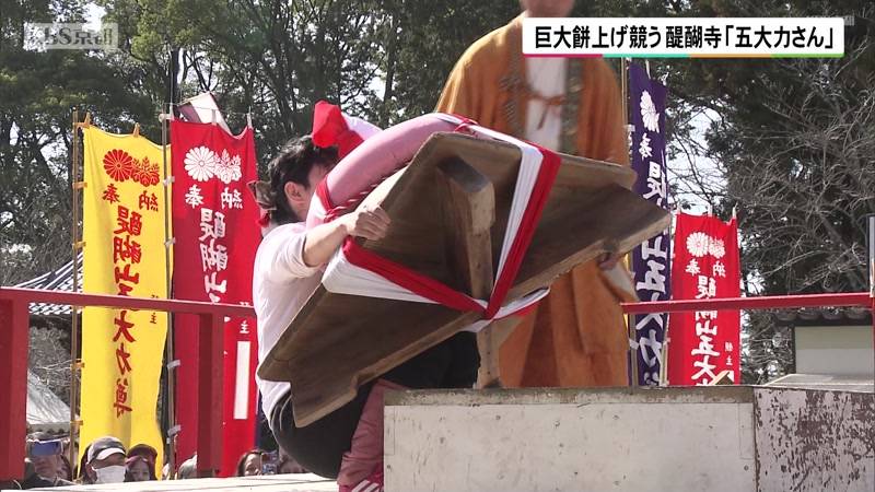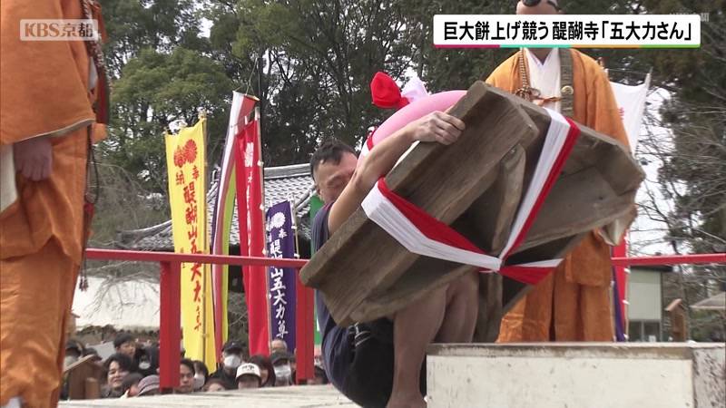 京都市伏見区の世界遺産・醍醐寺で紅白の巨大な鏡餅を持ち上げる時間を競う恒例の「餅上げ力奉納」が行われ、参加者らが自慢の力を競いました。