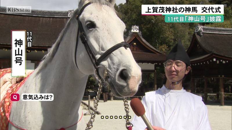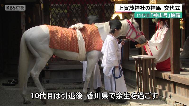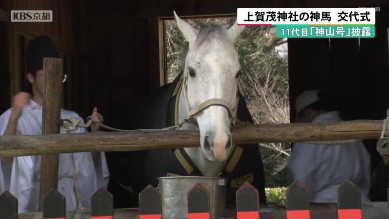 京都市北区の世界遺産・上賀茂神社で、参拝者を迎えたり神事に参加したりする白馬「神馬」の交代式が行われ、新たな神馬「11代目神山号」が披露されました。