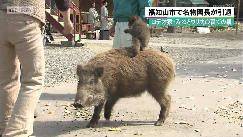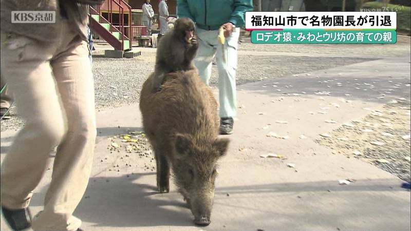 福知山市の三段池公園にある動物園の名物園長として親しまれた二本松俊邦さん81歳、およそ30年間務めた動物園を3月31日に引退しました。園内では、長年にわたり、動物たちの世話をしながら来園者を楽しませてきた二本松さんの功績に感謝する引退セレモニーが行われ、名物園長とその仕事を支えてきた妻のちとせさんに惜しみない拍手が送られました。花束を受け取った二本松さんは、動物園での楽しい思い出や苦労話を交えながら、「これまでみんなに助けられてきた感謝したい」と話していました。園長としてみんなが楽しい動物園をつくろうと奔走するなかで一躍脚光を浴びたのが、2010年にブームとなった「ロデオ猿」の登場です。ニホンザルの「みわ」がイノシシの「ウリ坊」の背中に乗って、走り回る姿を一目見ようと大勢の来園者が詰めかけ、市内は他府県ナンバーの車が渋滞の列を作るほどの人気を呼びました。